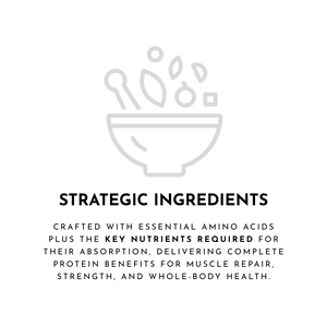 Strategic Ingredients: Carefully selected for their amino acid profiles along with the nutrients we need to absorb them, providing a diverse and complete range crucial for muscle growth and repair, as well as supporting optimal whole-body function.